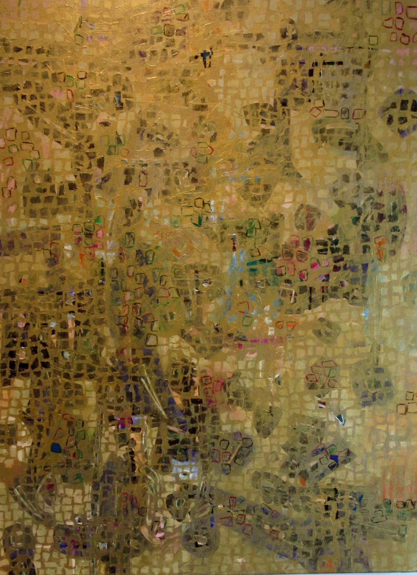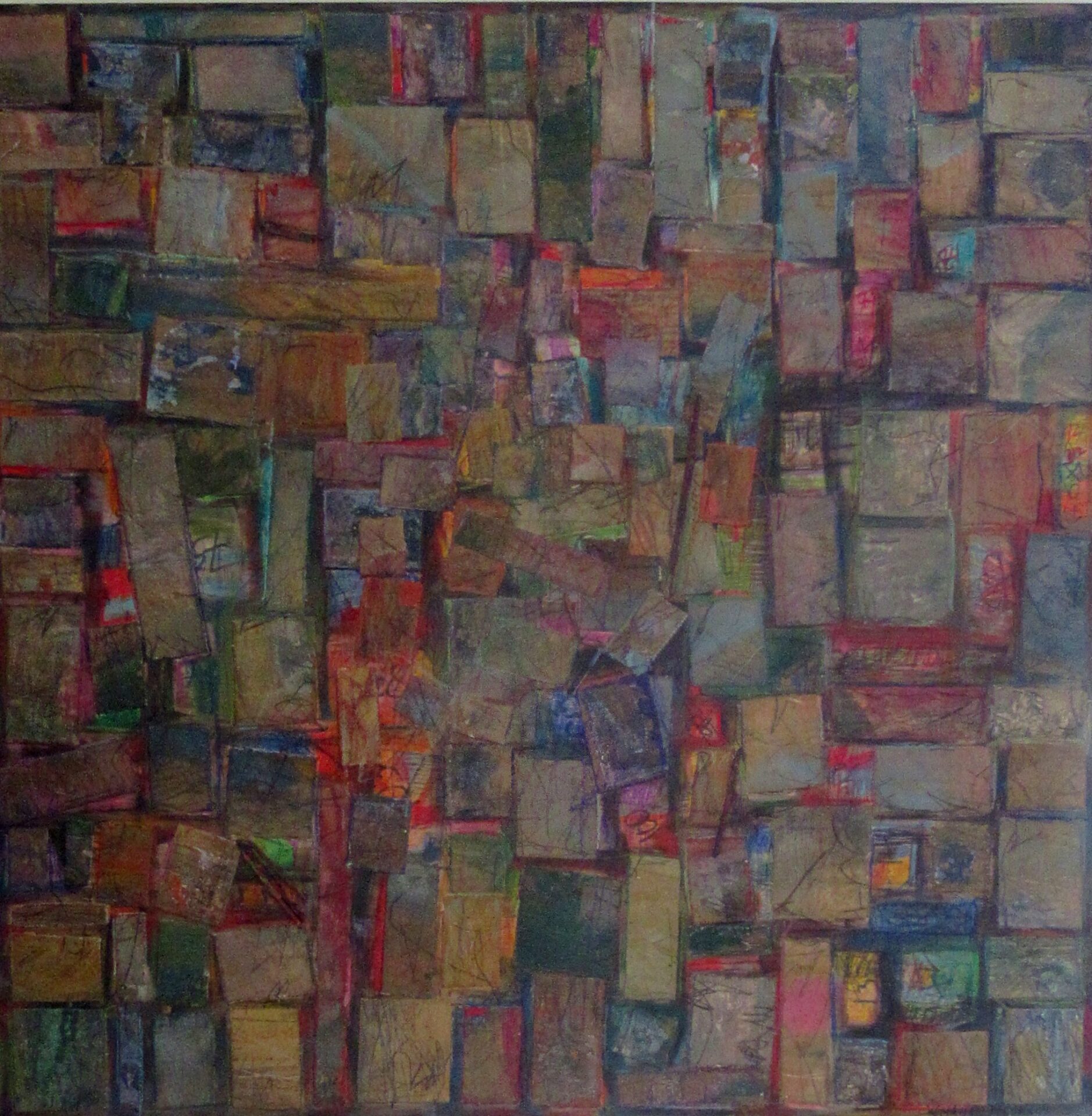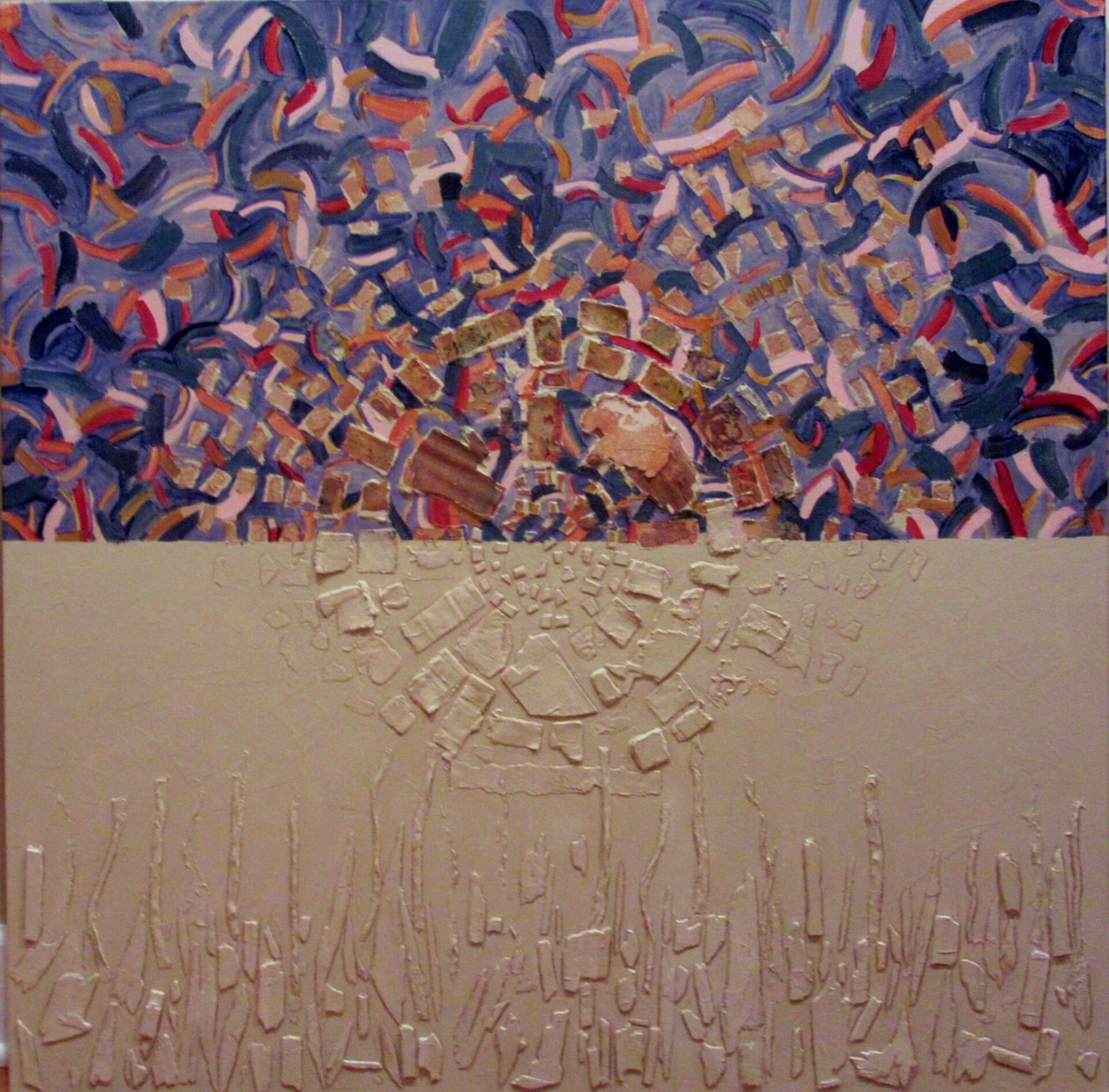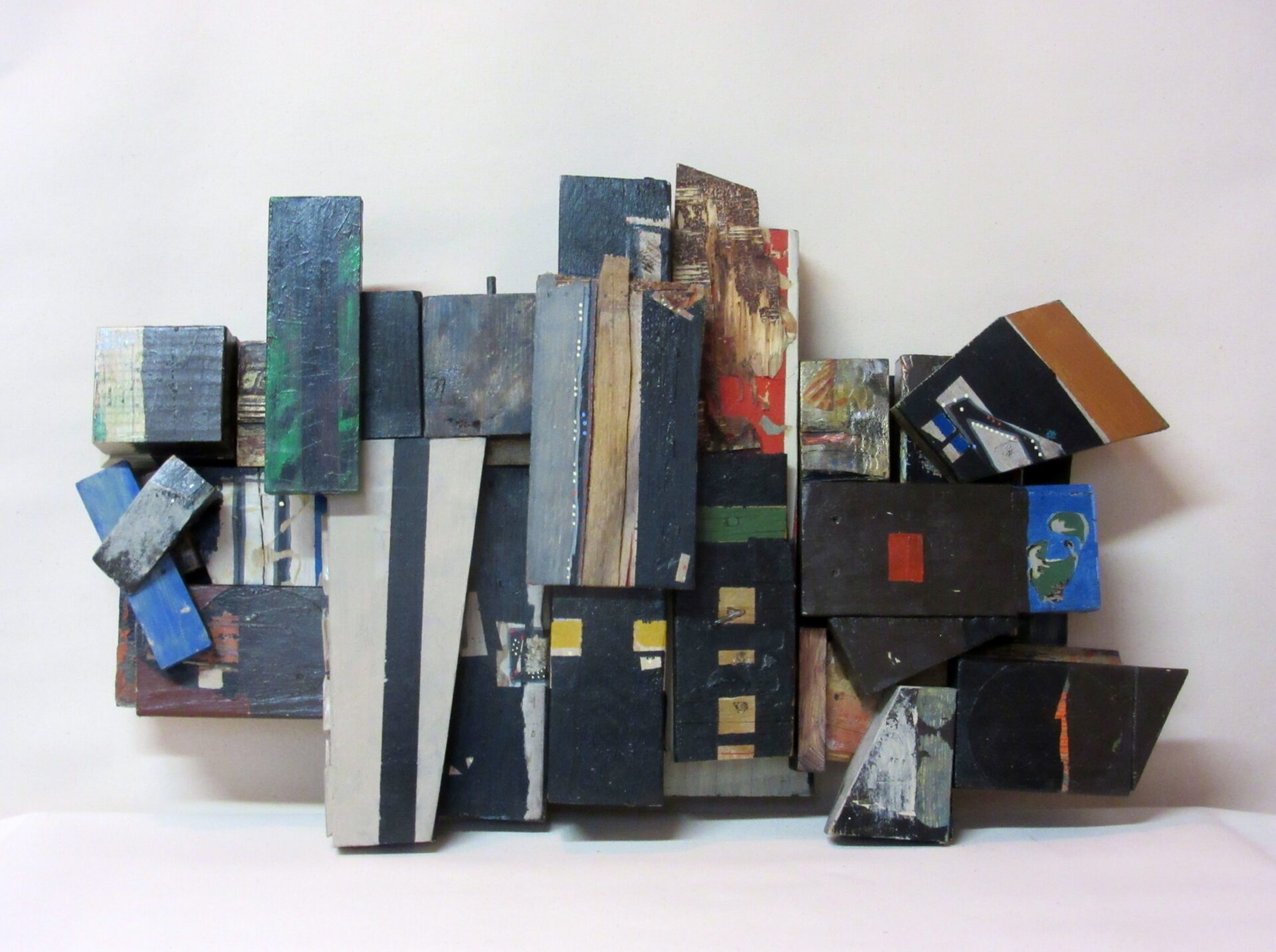 Description: Wall Sculpture. Acrylic, Ink, Collage, Found Wood.