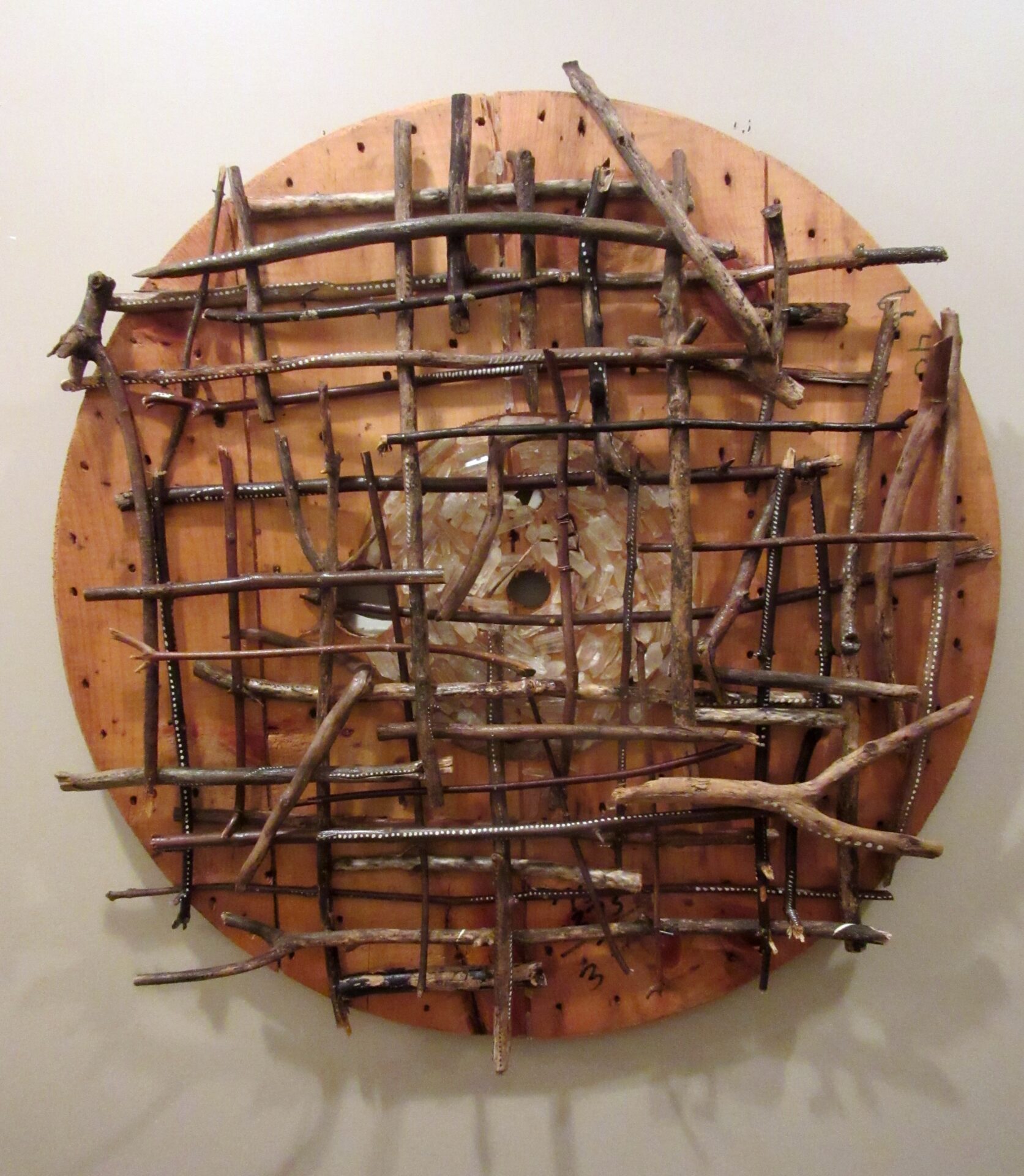 Description: Wall Sculpture, Wood Spool, Quartz Crystals, Branches.
